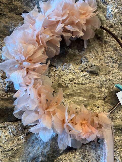 Couronne murale réalisée avec des fleurs stabilisées d’hortensia. Idéal pour décorer votre mur.