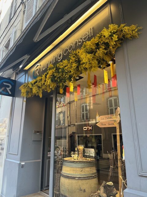 Décor de vitrine tout en Mimosa, réalisé pour la fête de La Percée, pour Running conseil, à Lons-le-Saunier dans le Jura.